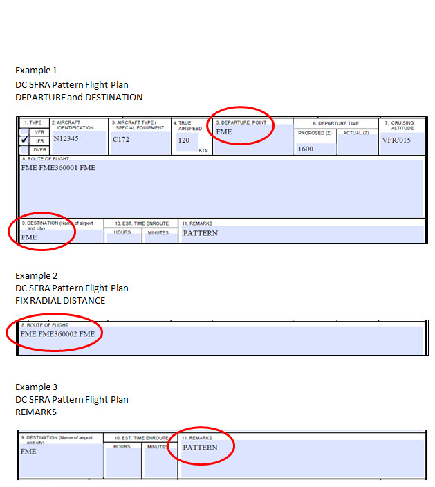 a. File a DC SFRA Pattern flight plan. The airport where the pattern work will be conducted is entered in both the departure and destination fields of the flight plan;