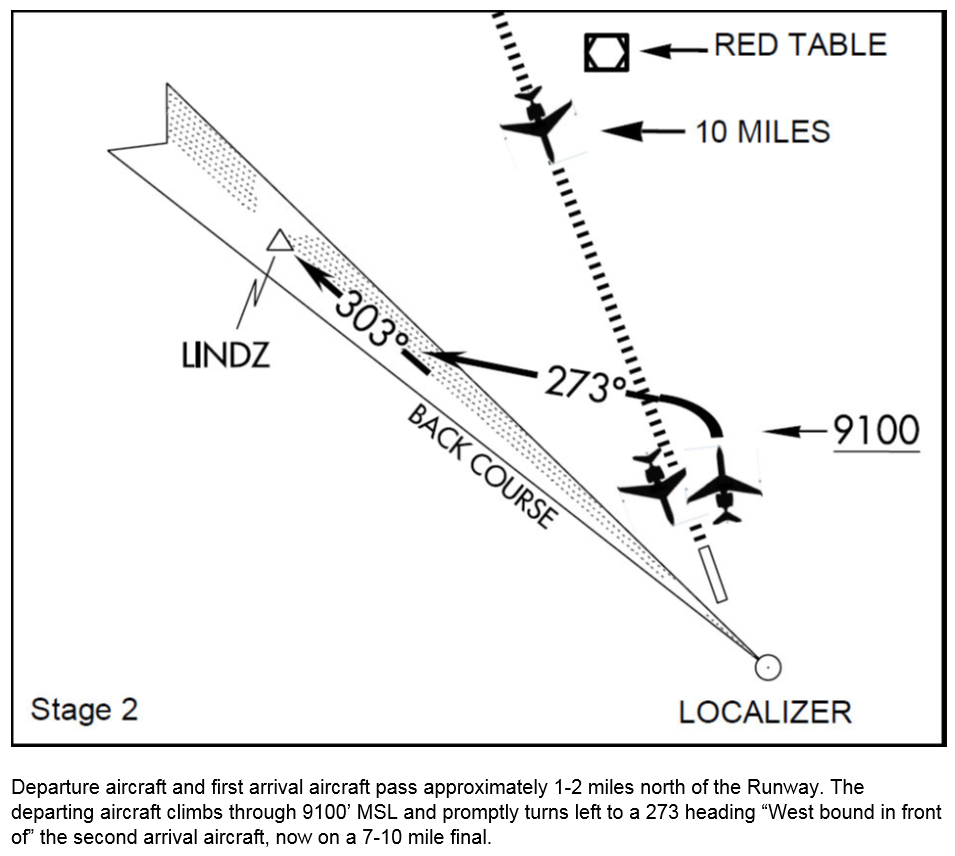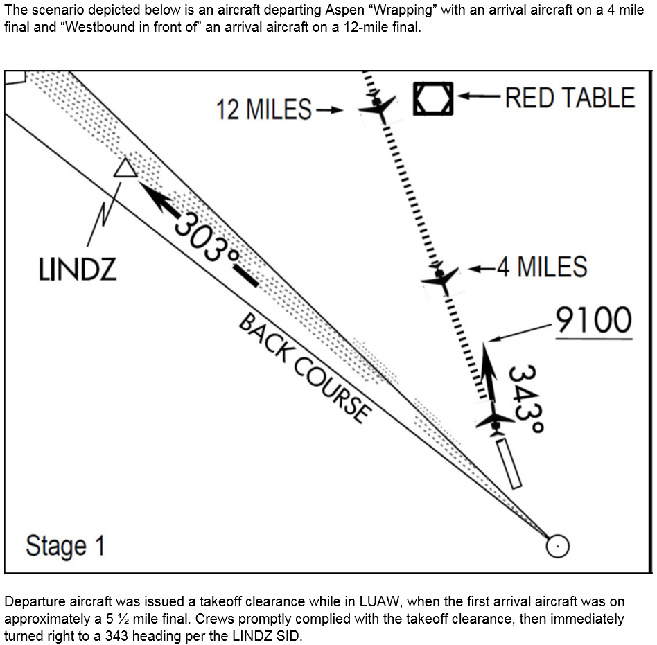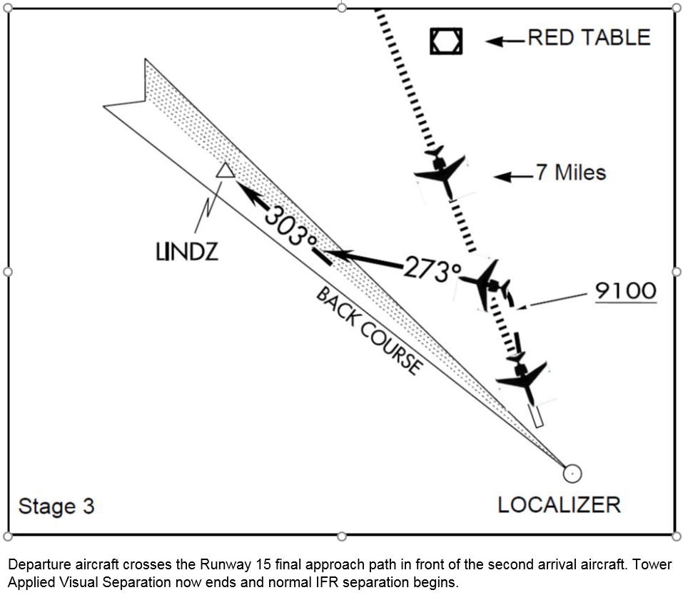 The “Westbound in front of” procedure utilizes Tower Applied Visual Separation and will be used when there is adequate spacing on the final approach path to allow a Runway 33 departure to become airborne, climb through 9100’ MSL, and make the left turn to 273 degrees per to the LINDZ SID prior to the arrival aircraft reaching a point 5-7 miles from Runway 15. Depending on the arrival aircraft speed and anticipated departure aircraft performance, the controller will issue a takeoff clearance and traffic information in time for the Runway 33 departure to start rolling prior to the Runway 15 arrival reaching a point approximately 10 miles from the airport. When Tower Applied Visual Separation is not possible, this distance will be increased to 12 miles or more. Flight crews should promptly depart, climb through 9100’ and execute the left turn to heading 273 degrees per the LINDZ SID in an expeditious manner to facilitate this air traffic separation procedure. Normal separation from other IFR aircraft will be ensured as soon as the departure aircraft crosses the final approach course, westbound on a 273 degree heading.