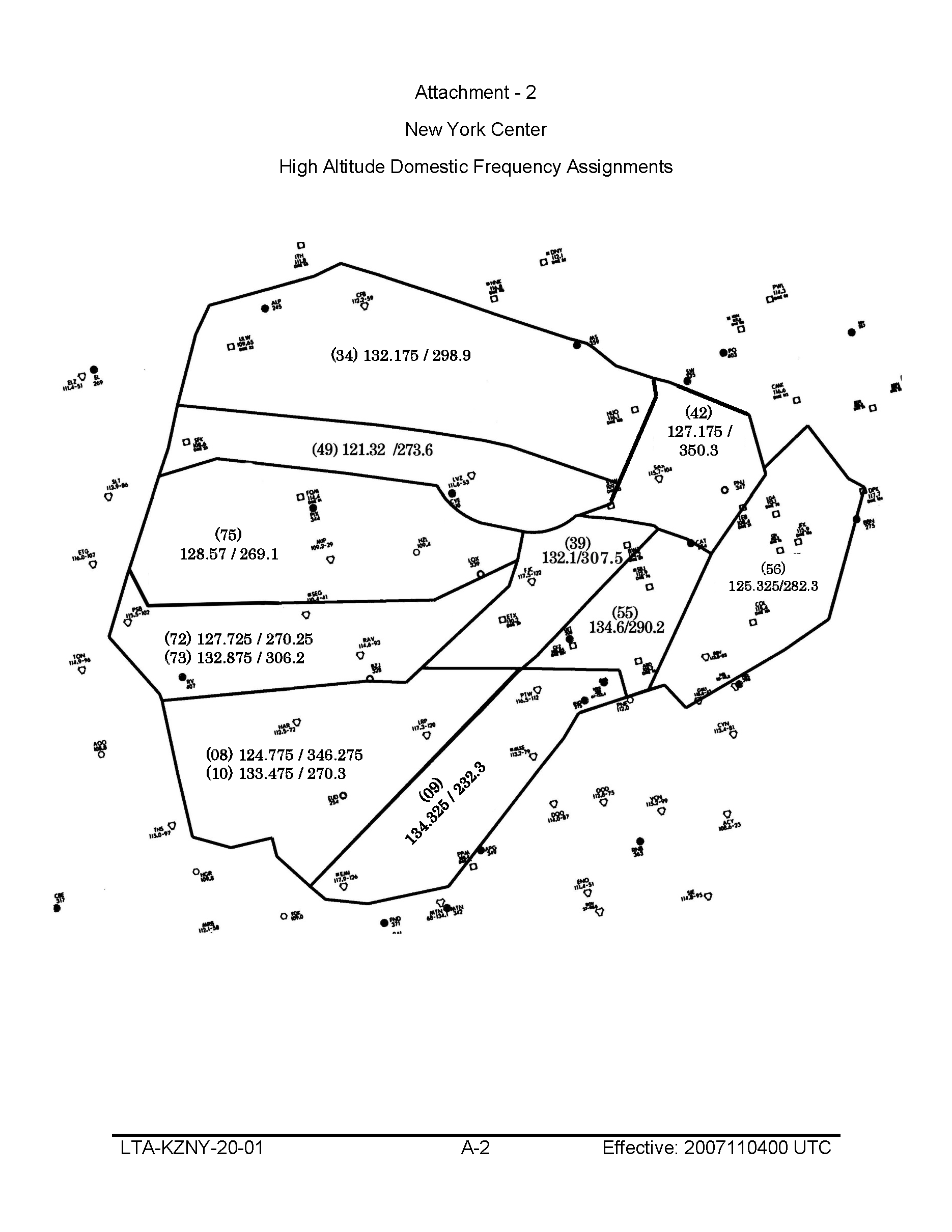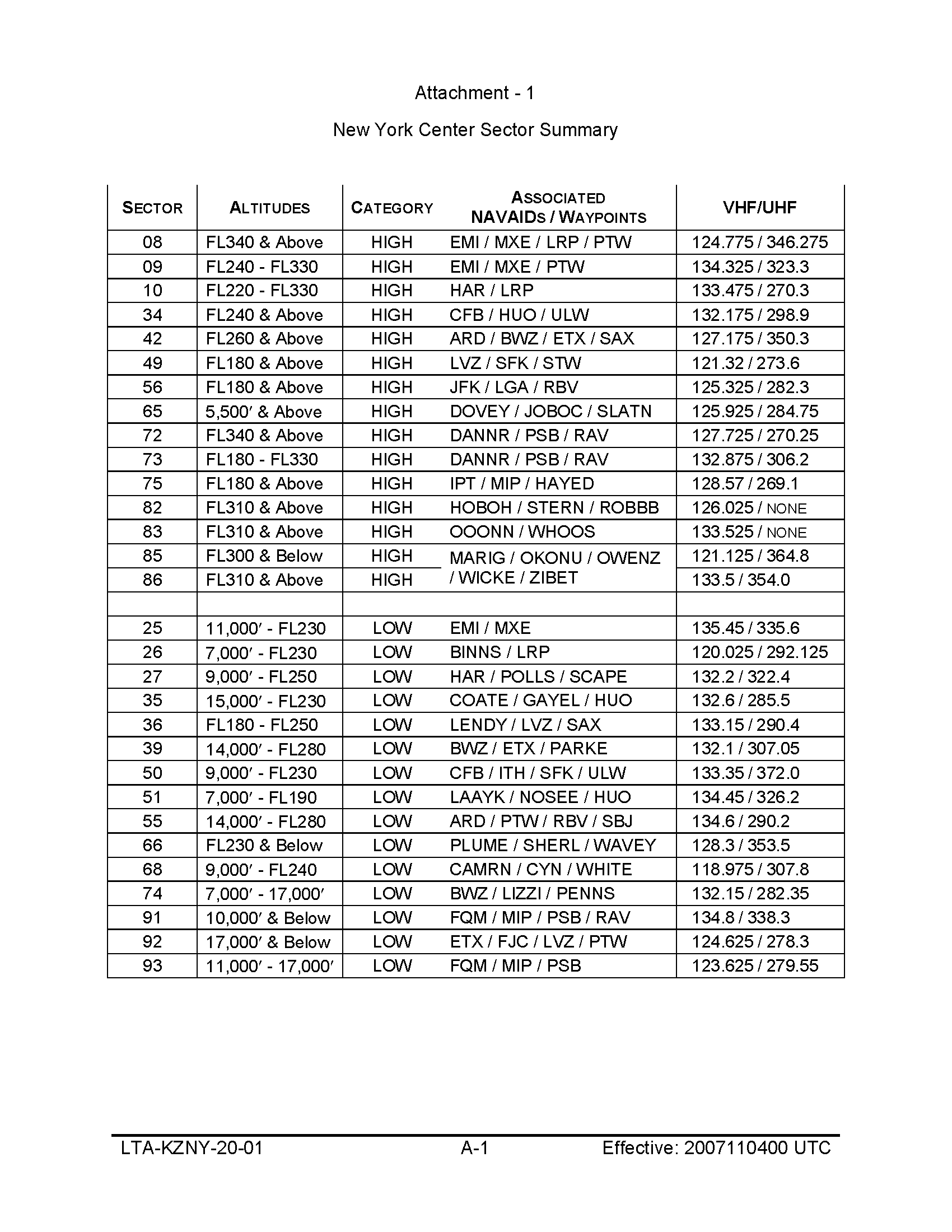 The correct radio frequency will normally be transmitted to pilots operating under IFR upon entering KZNY. In the event a pilot does not receive such information, the pilot should attempt to contact KZNY on the frequency associated with the position and altitude described on the attachments to this LTA. The altitude delineation between KZNY high and low altitude sectors is FL180, except where noted.
