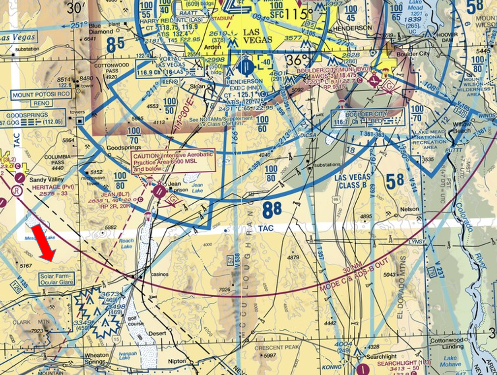 The Ivanpah Solar Electric Generating System at Ivanpah Dry Lake, CA (LAS189036-LAS193034) has the potential to produce sun glare to pilots landing/departing the Las Vegas valley. This plant encompasses approximately 3,500 acres west of Interstate Highway 15 near the California-Nevada State Line containing roughly 175,000 mirrors surrounding each of three collection towers.