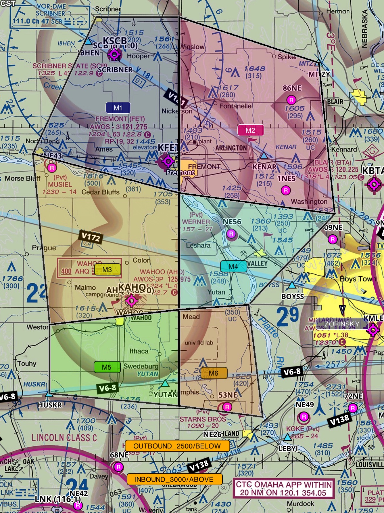 for M1 fly at 2,500’ MSL along 168th Street until reaching Bennington Lakes, then fly west on Hwy 36 to the Platte River, then enter M1. At or below 6,500’ after Bennington Lakes. M1/M3 boundary is Platte River.