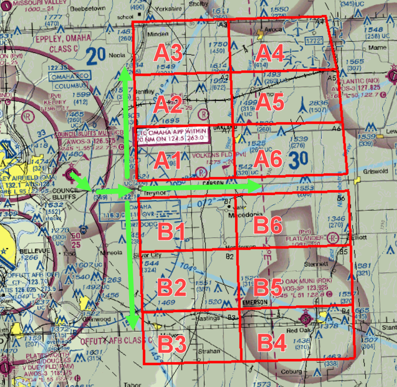 The ingress and egress routes are along Highway 92. Outbound to the practice area from KCBF at 3000’ eastbound after contacting departure. Returning to KCBF from the practice area, 2000’ westbound along Highway 92. The sectors that are north and south of Treynor will be accessed by 300th street. 300th street runs north and south from Treynor. Once the planes reach Treynor along Highway 92, they will turn either north or south to access the area they will be working in. The areas out by Carson will be accessed by continued flight along Highway 92 to Highway 59. Then proceed north or south into those areas. Returning to KCBF will be the same routes except in reverse and 2000’.