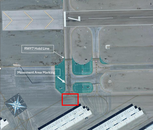 USE CAUTION, Runway Incursion Risk: The area between Taxiway G and the Runway 7 Runup Area (as depicted below) is not visible from the tower. The Runway 7 hold line at Taxiway G is in close proximity when entering the movement area. In addition, this area is adjacent to Hotspot 1 as described in the Chart Supplement.