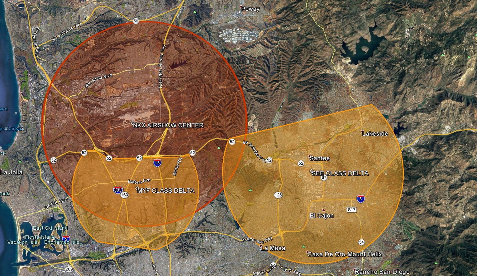 Five Nautical Mile (5NM) Radius of 32°52’07”N / 117°08’07”W or the Mission Bay VORTAC / MZB / 026° at 7 NM, surface to 16,000 MSL. When coordinated on a real-time basis, Montgomery (MYF) ATCT Class Delta will be accessible to ATC-approved aircraft into airspace south of highway 52 below 3,000' MSL except when the U.S. Navy Blue Angels are performing.