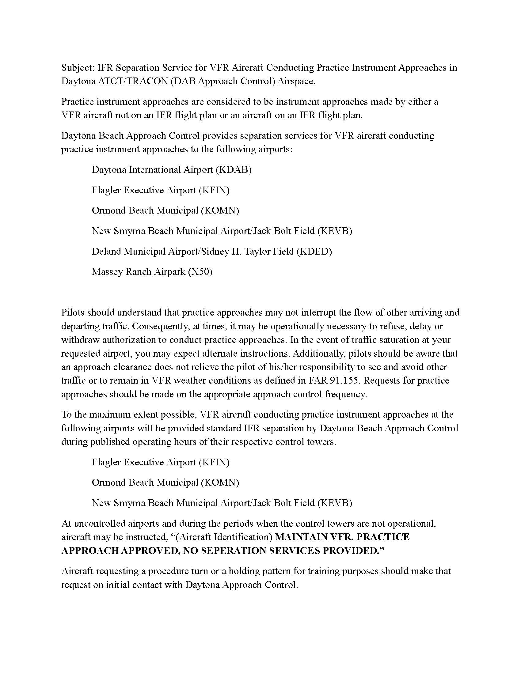 Subject: IFR Separation for VFR Aircraft Conducting Practice Instrument Approaches in Daytona ATCT/TRACON (DAB Approach Control) Airspace